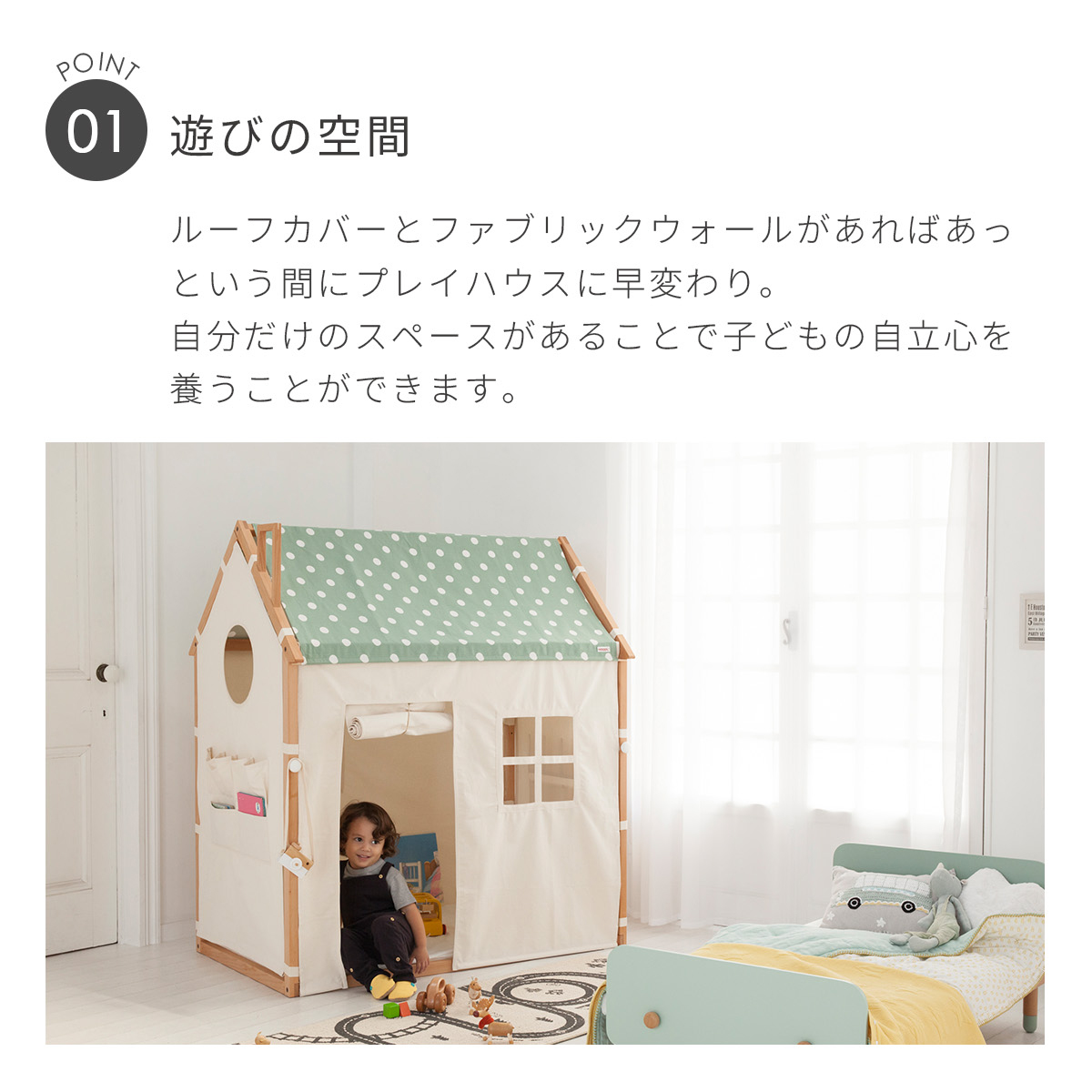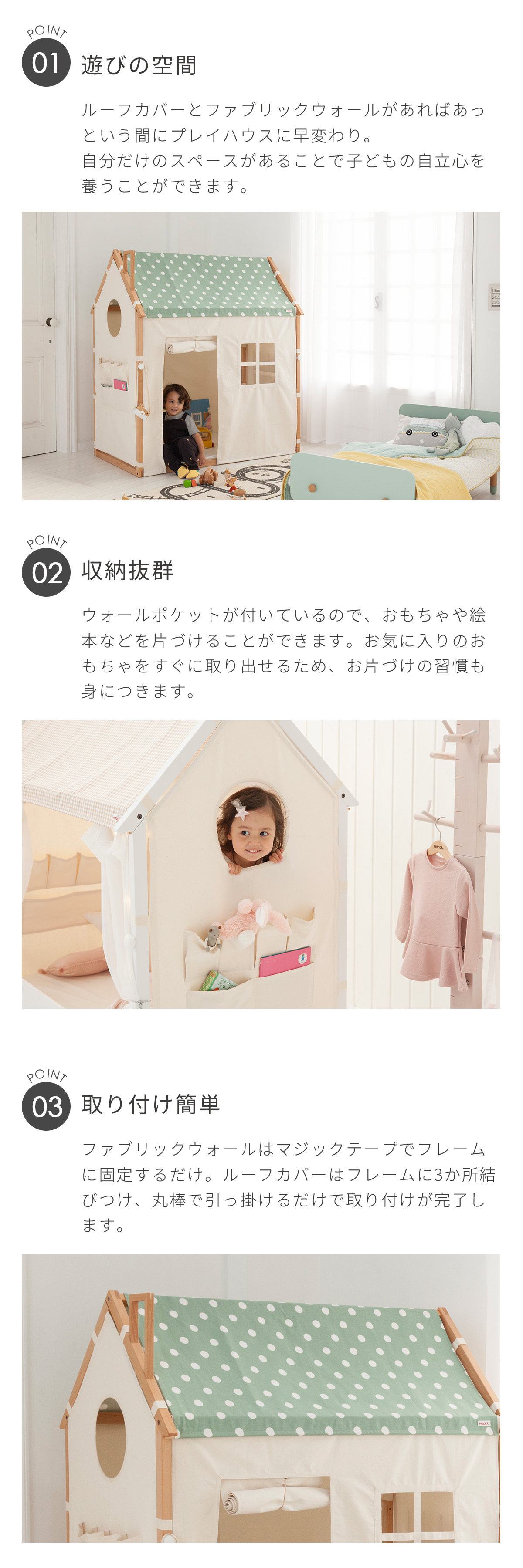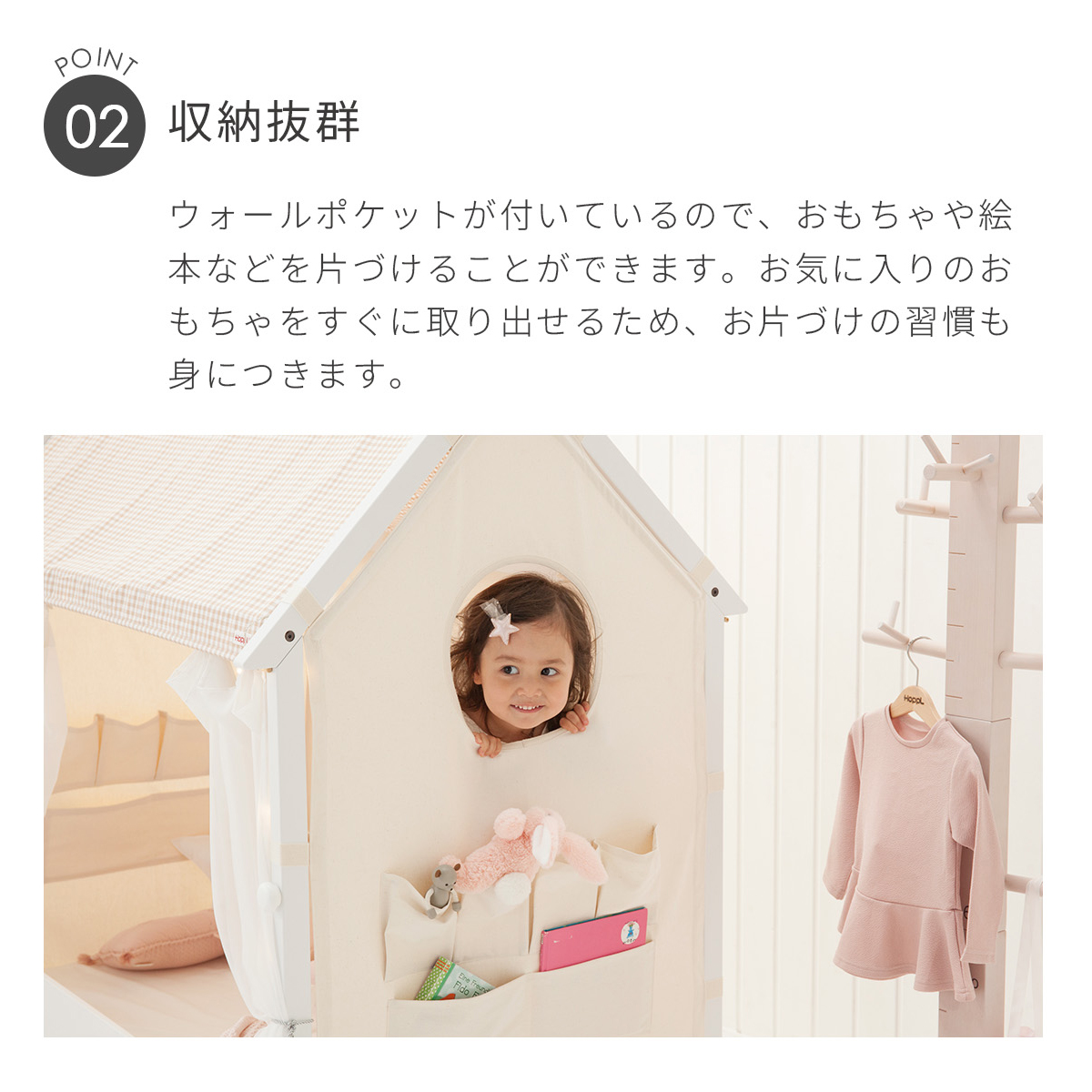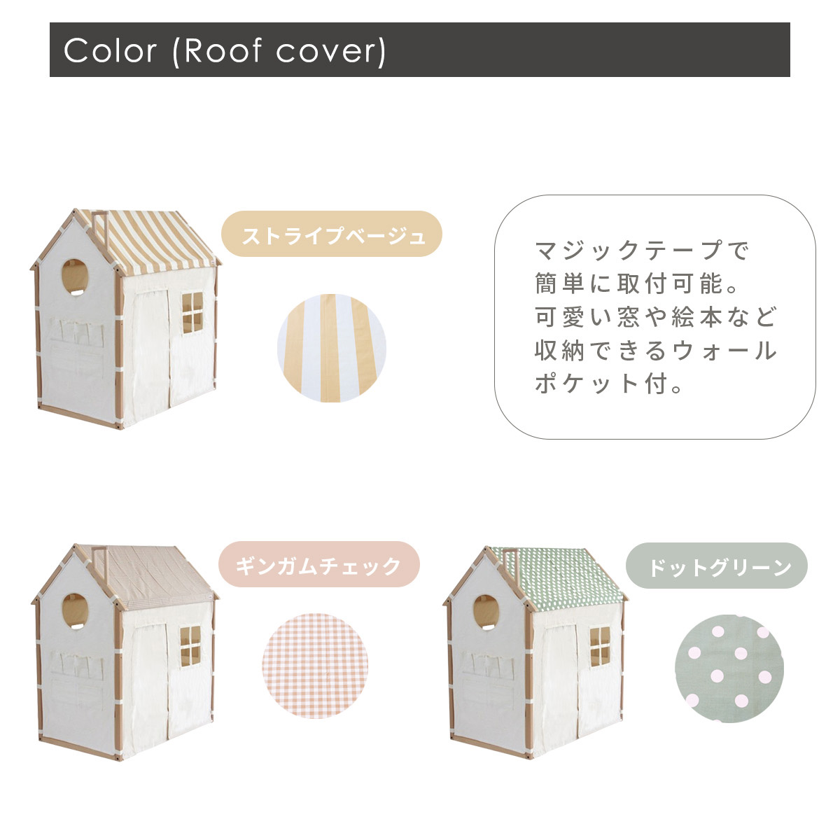 マジックテープでフレームにくくるだけでお取り付け可能です。 可愛い窓や、絵本などが片付けられるウォールポケットが付いています。
