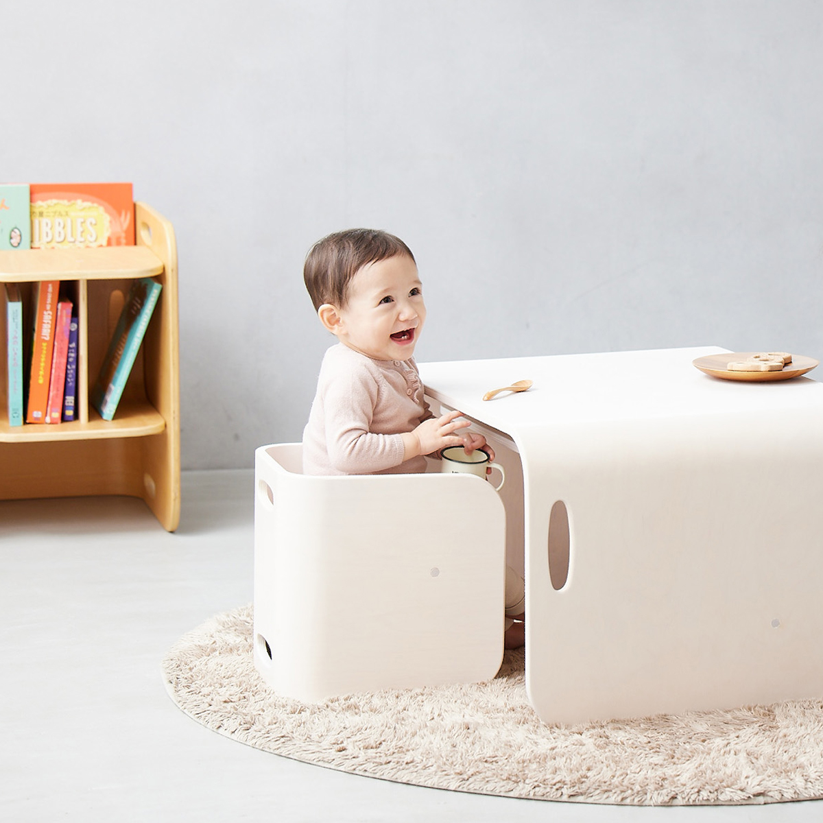 成長に合わせて転がすことで座面の高さを変えたり、チェア2つで椅子と机として使ったり、コロコロ転がして自由自在に使えます。