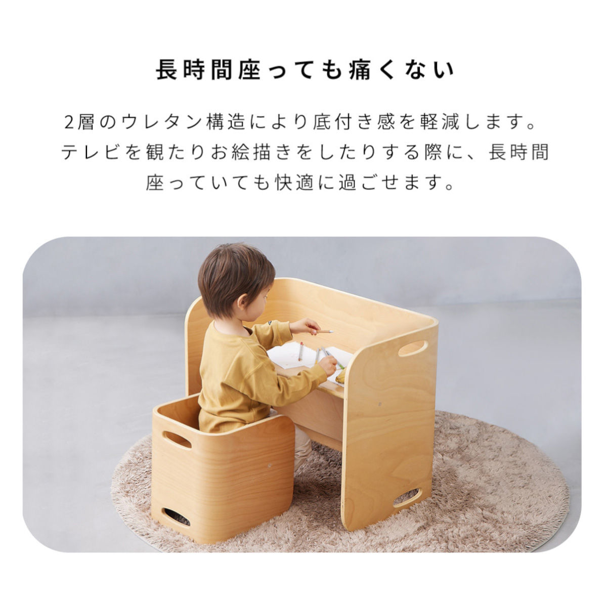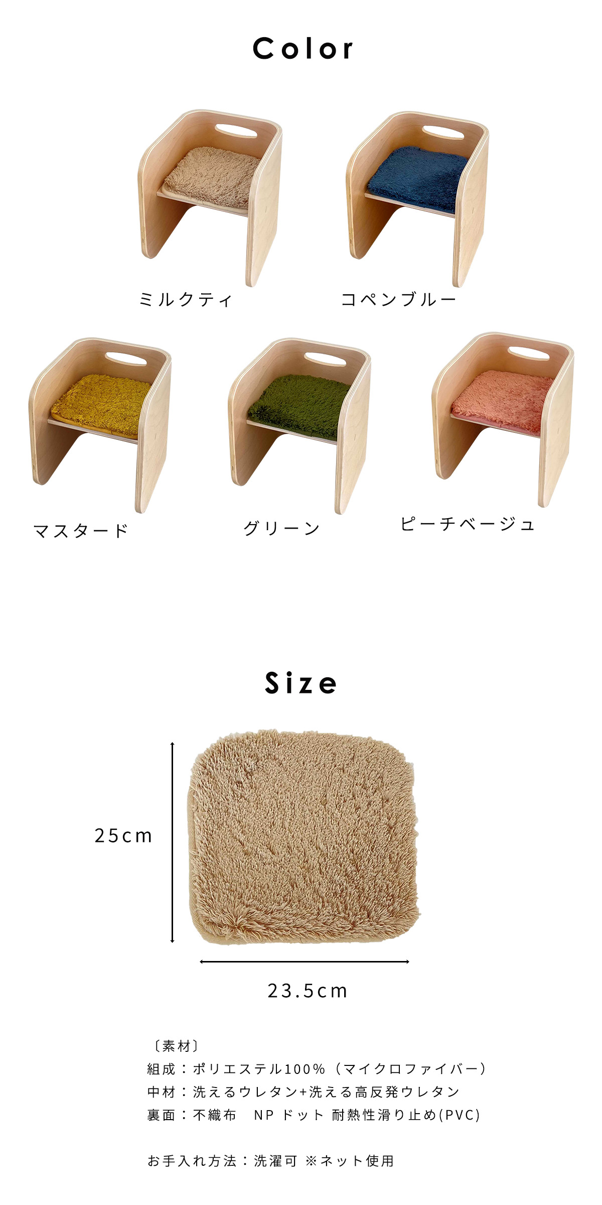 肌触りの良い高密度起毛仕上げで、テレビを見たり、お絵描きをしたり長い時間のおすわりでも安心です。