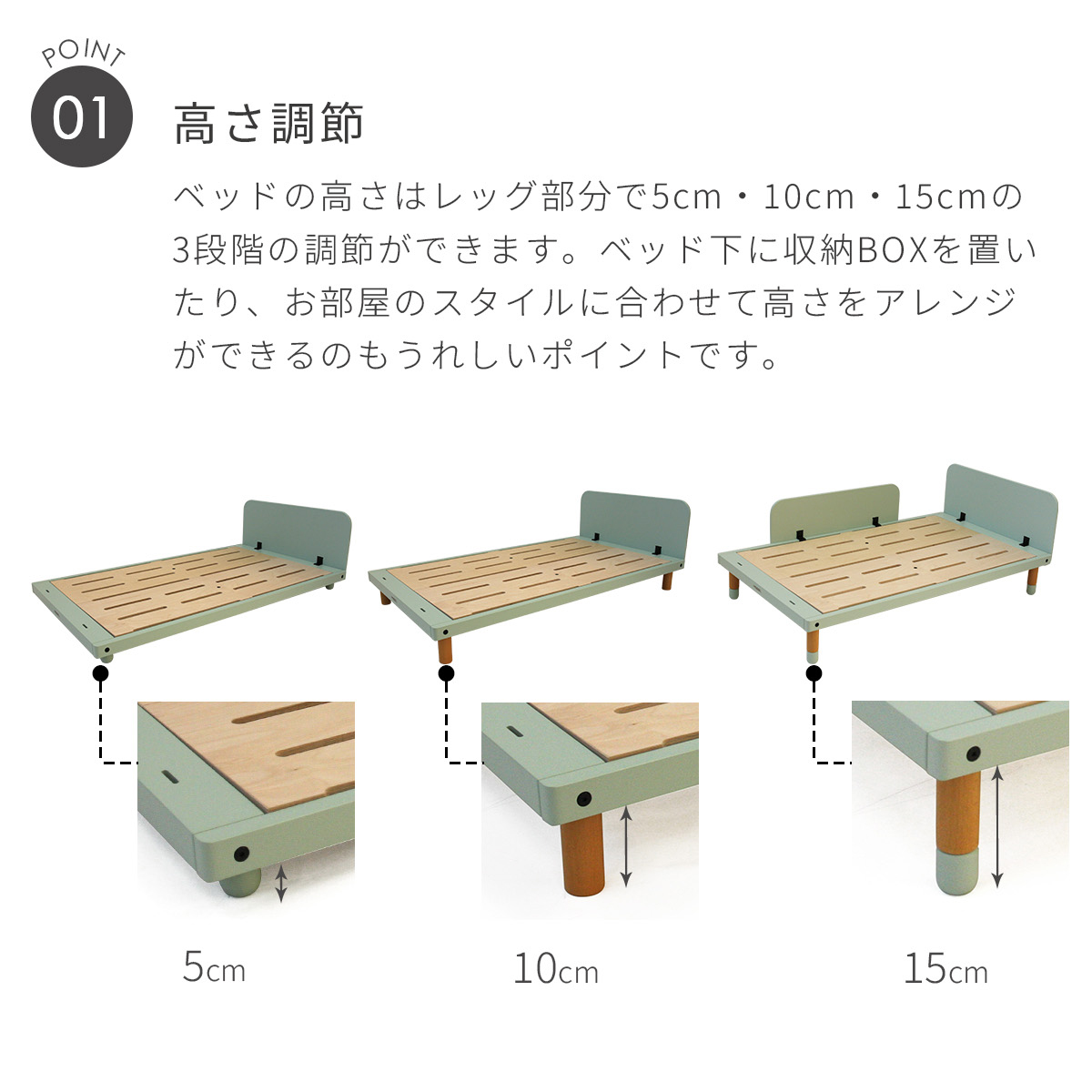 付属の脚で高さも4段階調整が可能。ヘッドガードとフットガードは寝返り防止のサイドガードとして使うこともできます。