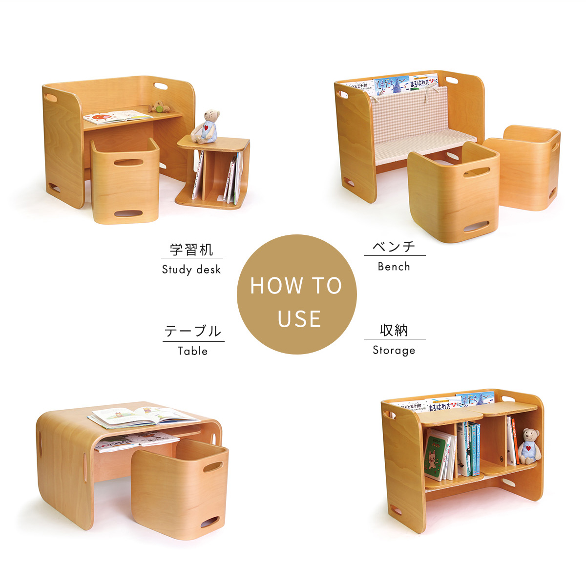 子どもの成長に合わせて、引き出し付きのデスクとして高さを上げての使用や、おままごともお店屋さん風になったり・・・コンパクトで場所をあまりとらないので、雰囲気も合わせてセットでの購入も増えています。
