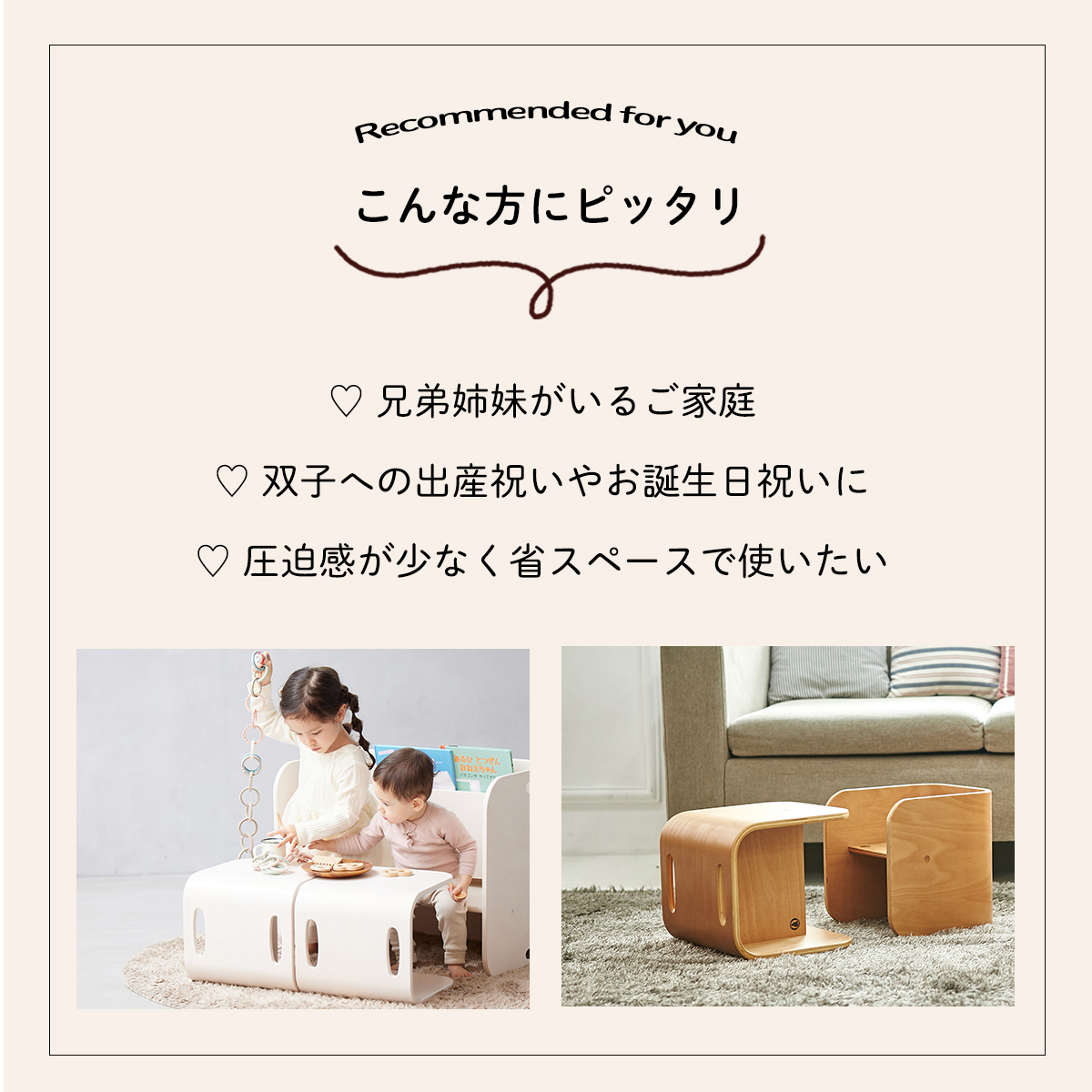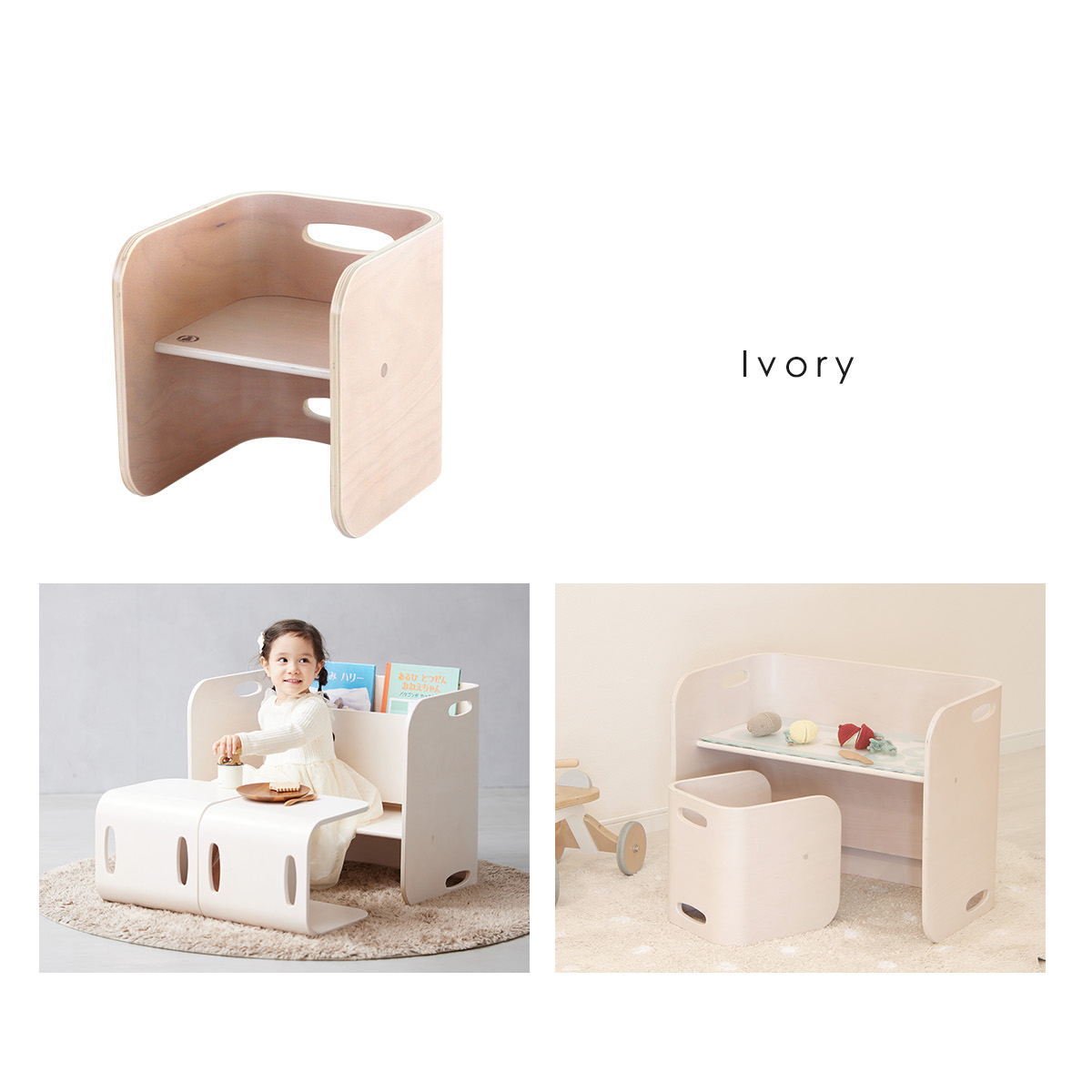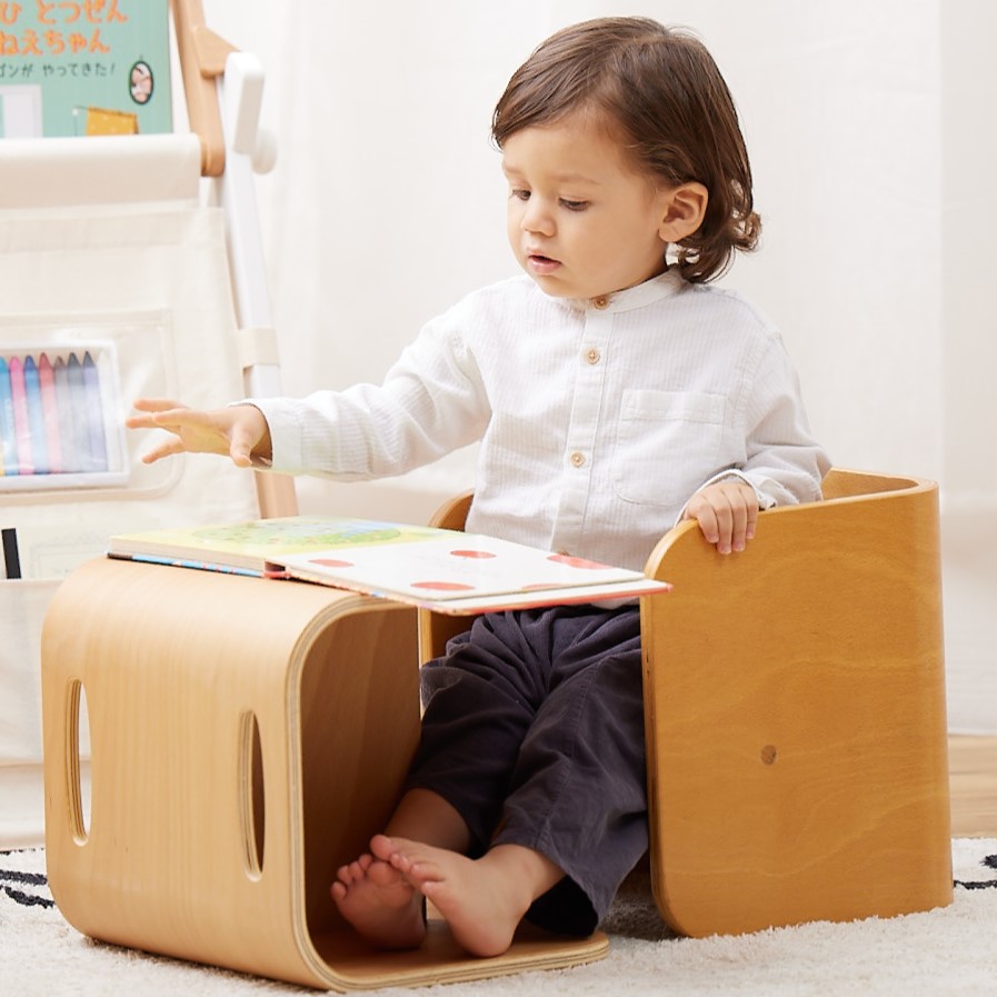 成長に合わせて転がすことで座面の高さを変えたり、チェア2つで椅子と机として使ったり、コロコロ転がして自由自在に使えます。