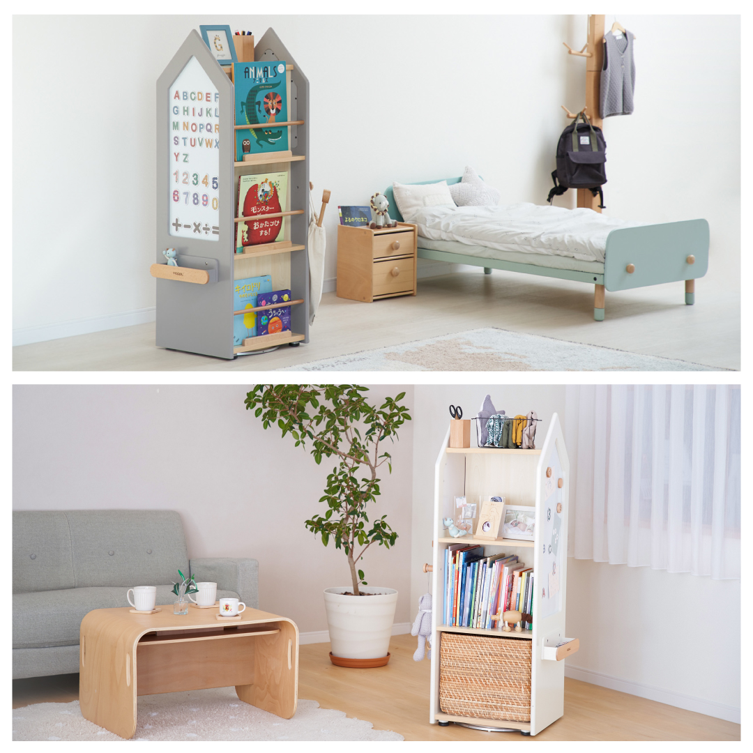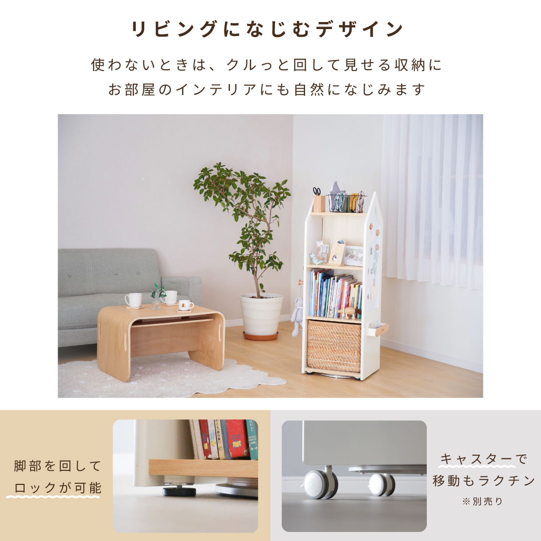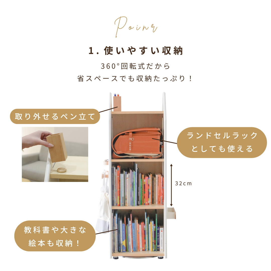 360°回転式で省スペースながら、絵本や小物、通園・通学グッズをすっきりまとめて収納できます