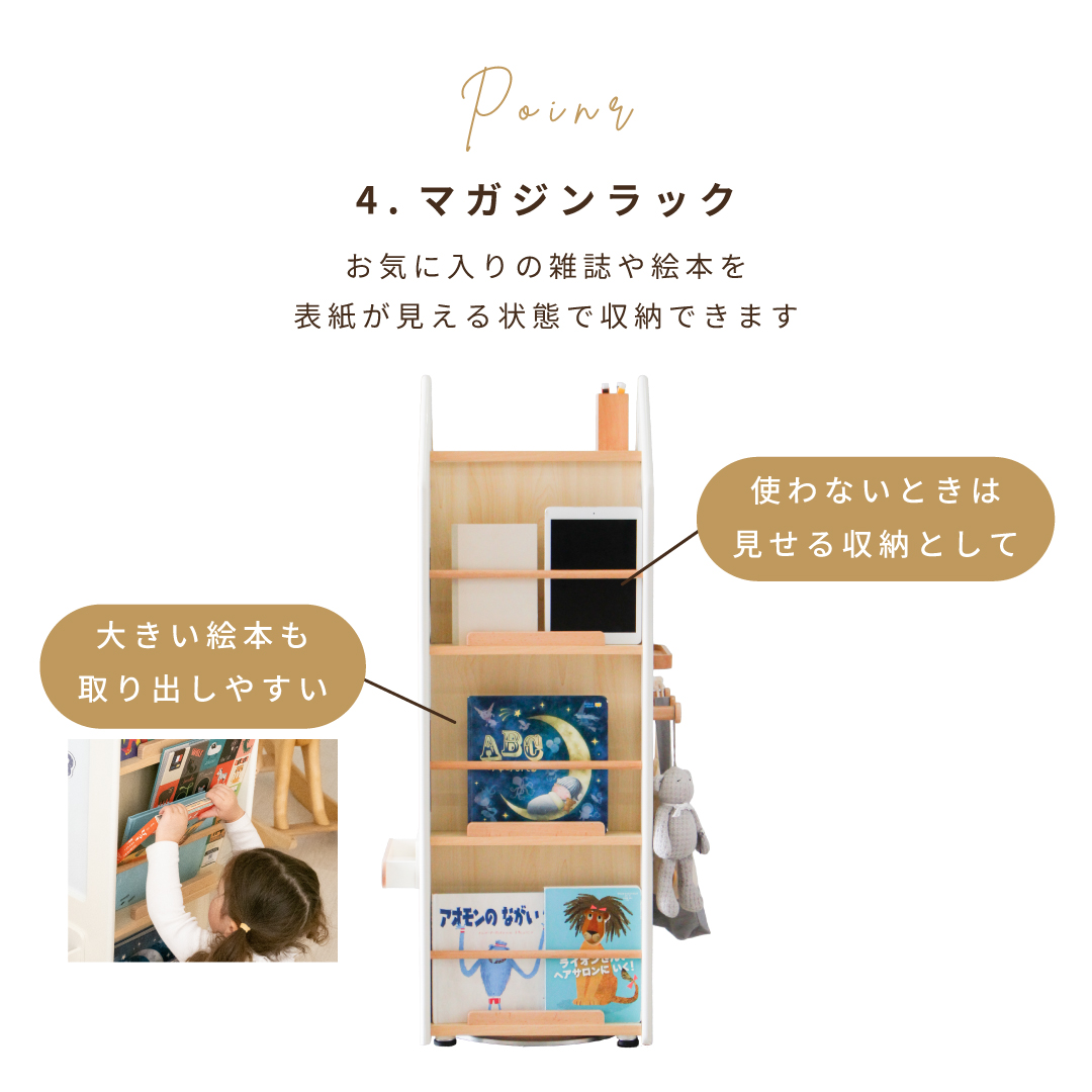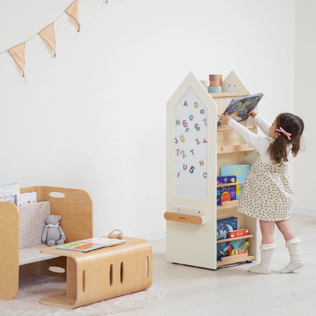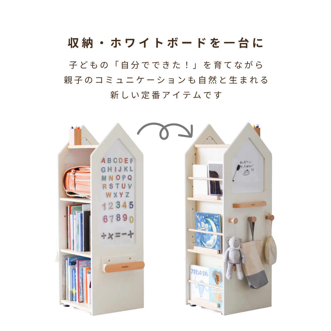 360°回転式で省スペースながら、絵本や小物、通園・通学グッズをすっきりまとめて収納できます