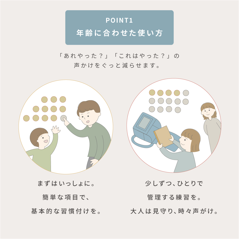 親の声かけを減らし、朝のバタバタや忘れ物を防ぎます。