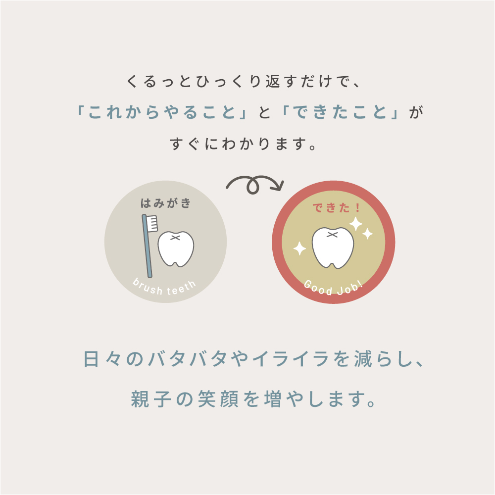 ホワイトボードなどに貼って使用し、終わったタスクをひっくり返すと「できた!」が分かるシンプルな仕組み。